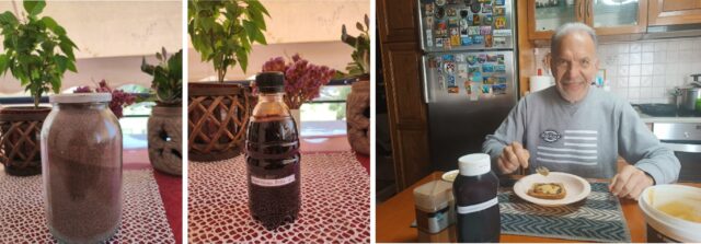 In a garden in Mytilene, the capital of Lesvos, this old knowledge continues to live on in a very personal way. About 34 years ago, when his daughter was born, Giorgos planted a carob tree in his garden. Over the years the small tree grew and began producing its first fruits. That is when curiosity emerged: what can one do with so many carobs? Giorgos, who is a chemist by profession and has always had a love for natural materials and experimentation in the kitchen, began asking older people on the island and searching for old recipes. Gradually, he started trying different preparations himself and creating products from the fruits of his carob tree.